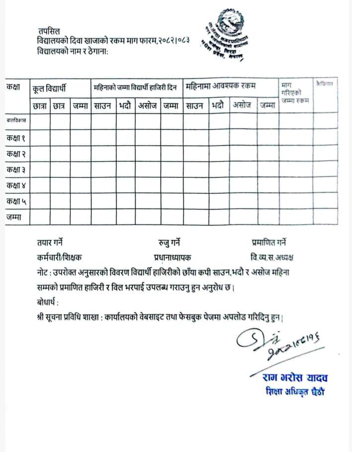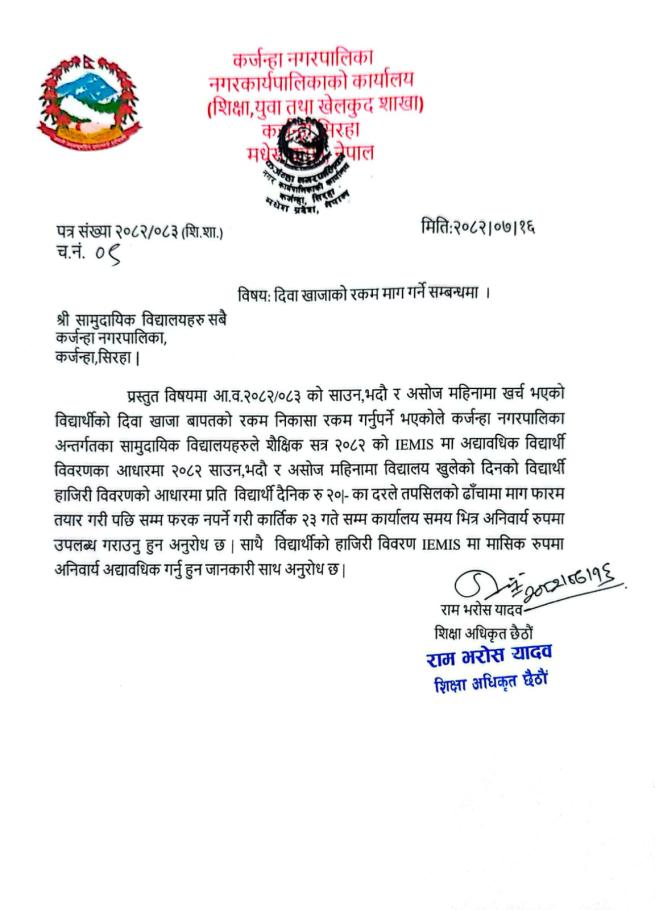 » बिषय:- दिवा खाजाको रकम माग गर्ने सम्बन्धमा ।