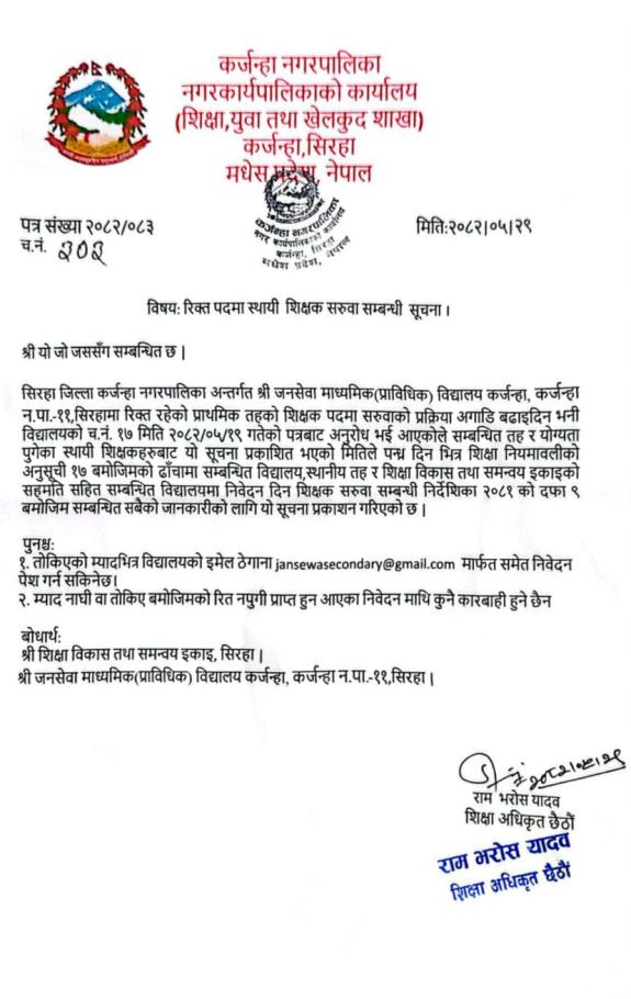 » बिषय:-रिक्त पदमा स्थायी शिक्षक सरुवा सम्बन्धी सुचना ।