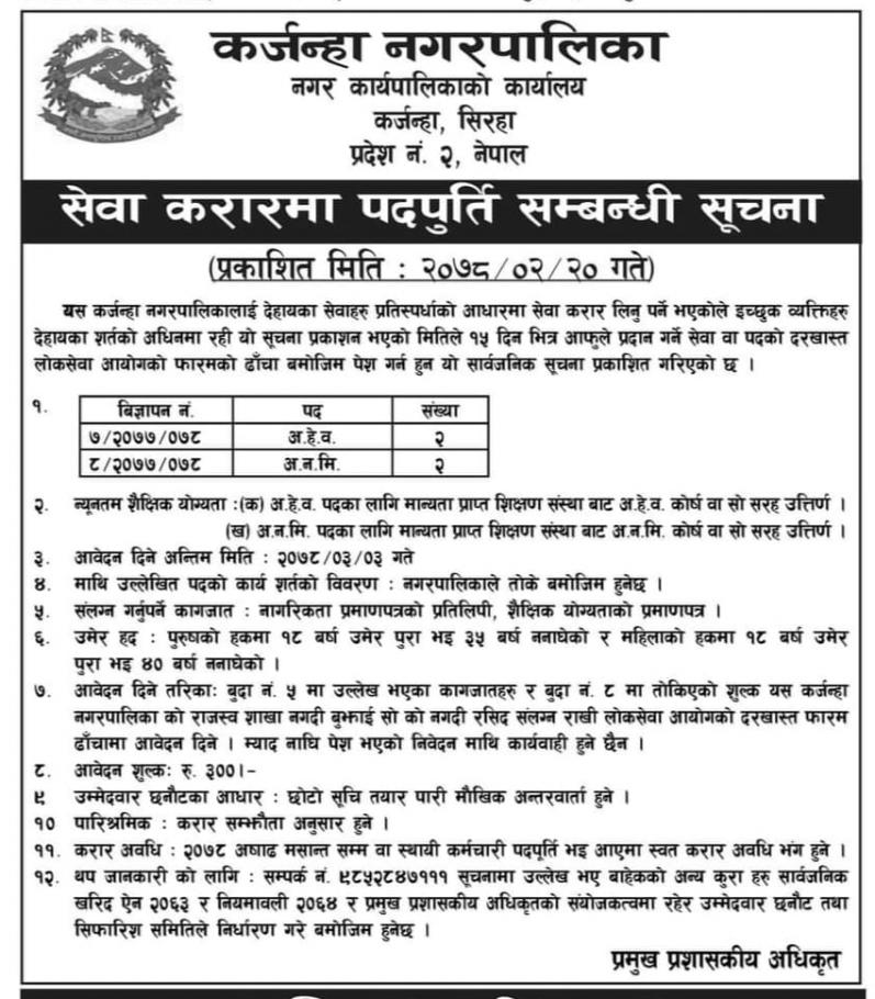 » सेवा करारमा पदपुर्ती सम्बन्धी कर्जन्हा नगरपालिकाकाे सूचना